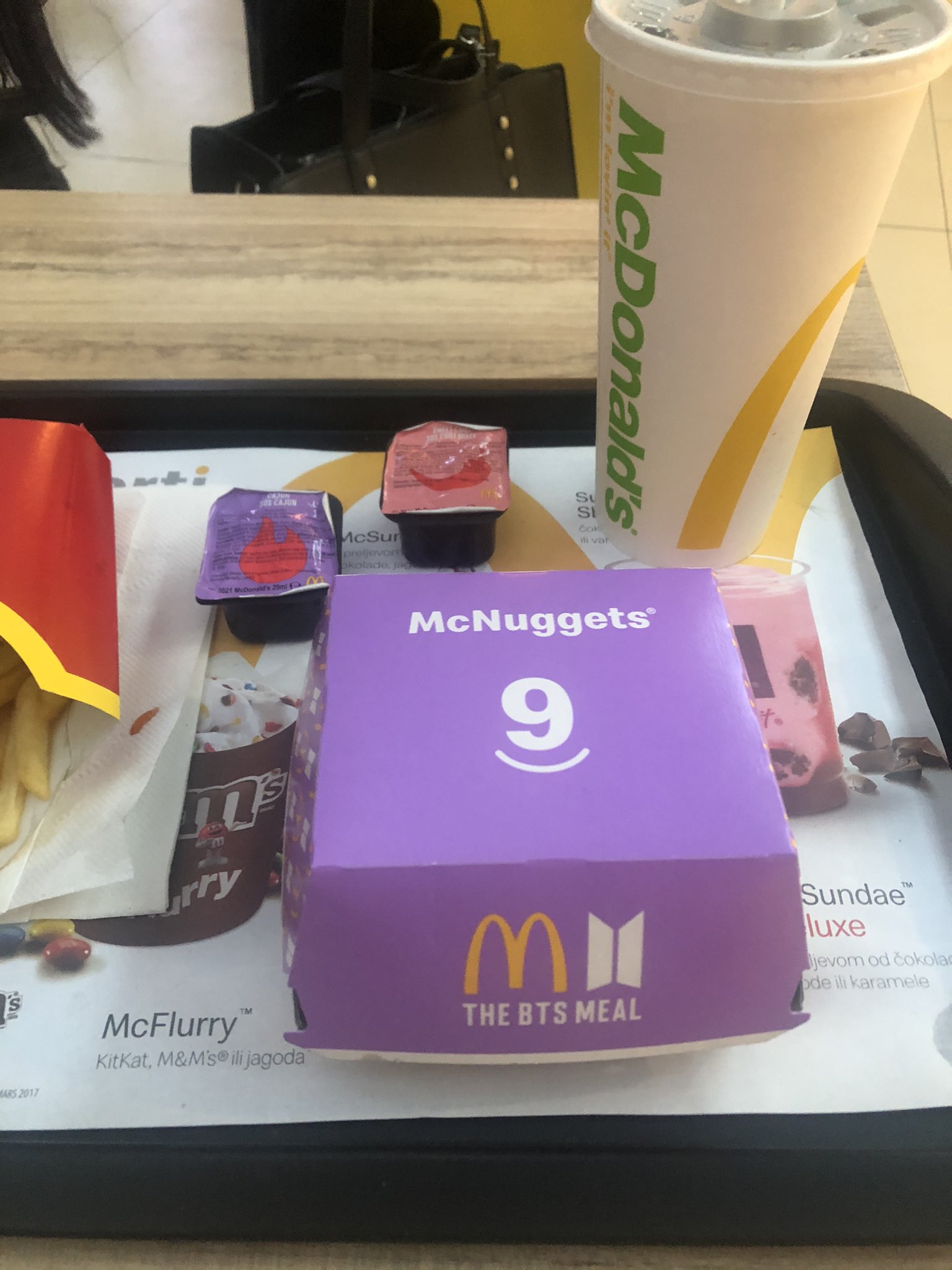 By introducing BTS Meal the worlds biggest K-pop group will get to build yet another bridge that connects them to BTS ARMY. BTS meal 9 piece chicken McNuggets box BTS meal Large drink cup BTS meal Cajun sauce BTS meal chilli sauce Packaging had been cleaned and wa Chat to Buy. 21 2021 at 1146 am.